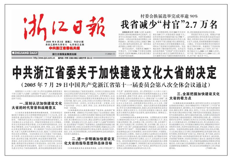 2005年7月,中共浙江省委召開十一屆八次全體會議,審議并通過《中共浙江省委關于加快建設文化大省的決定》,明確提出實施文明素質工程、文化精品工程、文化研究工程、文化保護工程、文化產業促進工程、文化陣地工程、文化傳播工程、文化人才工程等“八項工程”。 浙江省委宣傳部供圖
