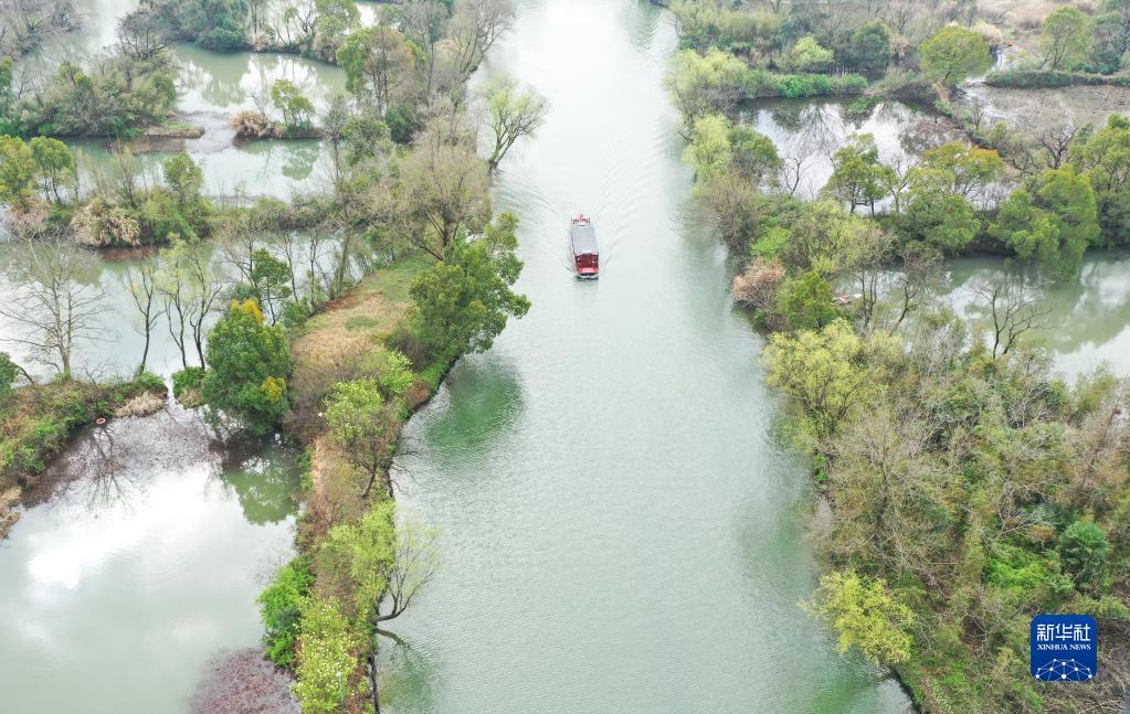 游船行駛在西溪濕地水道上(2021年3月2日攝,無人機照片)。新華社記者翁忻旸 攝