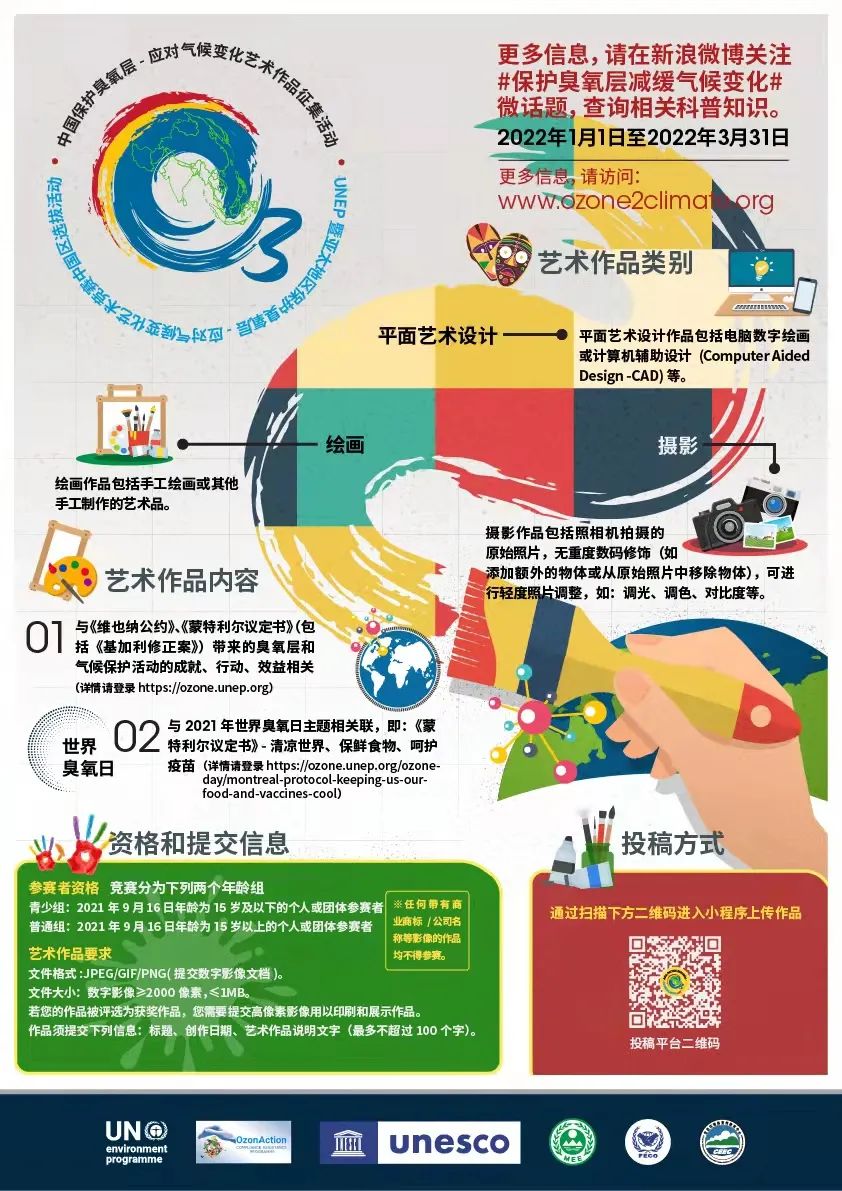 ?????為配合UNEP亞太區(qū)域保護(hù)臭氧層-應(yīng)對(duì)氣候變化藝術(shù)大賽,鼓勵(lì)中國(guó)公眾特別是青少年關(guān)注參與保護(hù)臭氧層和應(yīng)對(duì)氣候變化行動(dòng),在生態(tài)環(huán)境部和UNEP指導(dǎo)下,生態(tài)環(huán)境部對(duì)外合作與交流中心和生態(tài)環(huán)境部宣傳教育中心聯(lián)合主辦中國(guó)保護(hù)臭氧層-應(yīng)對(duì)氣候變化藝術(shù)作品征集活動(dòng)暨亞太地區(qū)保護(hù)臭氧層-應(yīng)對(duì)氣候變化藝術(shù)競(jìng)賽中國(guó)區(qū)選拔活動(dòng),評(píng)選出的優(yōu)秀作品將代表中國(guó)參加UNEP亞太區(qū)域決賽。