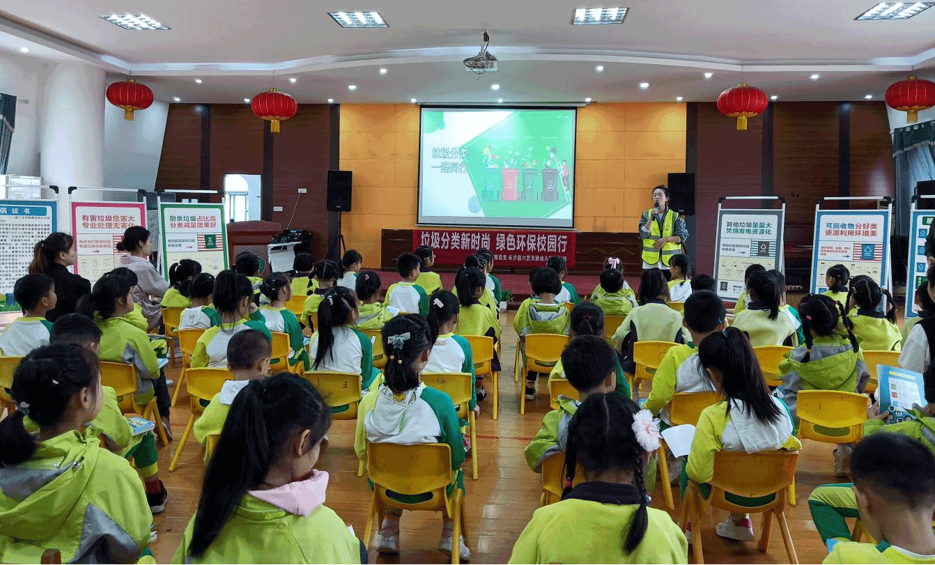 2021年4月26日,六藝天驕幼兒園聯合長沙縣公民辦幼兒園進行“垃圾分類新時尚 綠色環保校園”垃圾分類主題宣傳教育活動,講師先給孩子們觀看了長沙縣垃圾分類主題曲《你會分類嗎》的視頻。膾炙人口的旋律,朗朗上口的歌詞,現場的孩子們一下子就記住了“你會分類嗎”這一句,并跟著視頻又唱又跳起來。